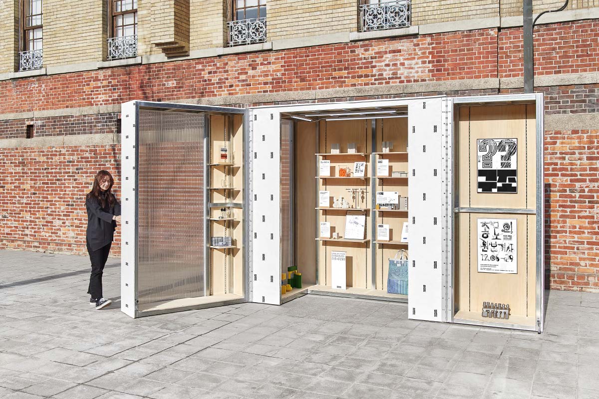 《어떤구조》는 정방형의 공간으로 두 개의 문을 열면 전면이 개방되며 확장됩니다. 두 문을 닫으면 2400×1450×2400mm으로 작은 사이즈, 두 문을 열면 4800×2400×2400mm으로 확장됩니다. 투명 렉산을 활용해 내부를 볼 수 있도록 했고 내부에는 거치형 선반을 설치해 작은 전시품들을 전시할 수 있습니다. 벽면을 사용하고 싶다면 선반을 분리해 자유롭게 벽면을 활용할 수 있습니다. 모든 문을 오픈해 전면의 공간과 호응하는 워크샵을 진행할 수 있습니다.